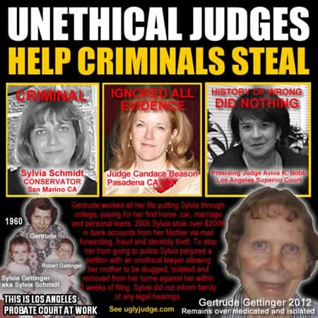 This is a factual account from a man who grew up with a sister with (Psychopath tendencies) and a narcissistic mother. Sylvia Schmidt his sister never had a close relationship with anyone in her family. Sylvia was disinherited in 2000 by her father who she was estranged from after the divorce in 1982. When she was ultimately disinherited this put her into a rage and war out to get even with her brother Robert. She began a scam to embezzle $200k in bank funds which she would blame were missing due to Robert’s debt. Ultimately the goal was to force Gertrude into a conservatorship via, fraud, mail forwarding, burglary and perjury. Gertrude the victim would be isolated, mentally abused, starved and made out to look psychotic by Sylvia and Gary A. Schmidt. The ultimate goal was to take over Gertrude’s estate which consisted of a 6 unit apartment building in Hollywood CA and approx. 15 bank accounts with over one million dollars. Your about to read about the sheer corruption and dishonesty by Los Angeles Superior Court and all the lawyers involved who feast off the bones of the weak and elderly for profit. They all hide behind a fake image of “The protector”. The system is beyond broken, it’s been manipulated into a money machine with the motto “Isolate, medicate then liquidate”. The same judges, lawyers and government agencies all cover for themselves. Matters not who you are only that you have money or property which can be liquidated into legal fees. There have been numerous media stories exposing the system with the same results, a few victims get justice, the dishonorable judges are allowed to retire early and keep all their generous benefits and go work in the private sector still controlling the other villains still working the system. It’s all made up to look like there is change when nothing has changed SEE THESE STORIES