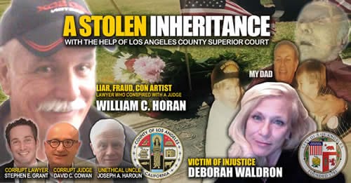 In the spring of 2009, Deborah (the daughter, and Registered Nurse Practitioner of Timothy Augustin Horan) was asked to help her father out when he required open-heart surgery. She had his home cleaned, meals made and took care of his every need as an RN before, during and after his hospitalization. My uncle decided to “get rid of me” by bullying me and threatening to kill me after he found out that my brother and I would be splitting the trust 50/50, and he was not included. MY protective father told me he would indeed kill me over the money as he referred to his brother William as “Billy the Kid”. William was never trusted during his entire lifetime to represent him as an attorney, and chose to place the trust on his personal computer and a computer trust document. My father fearing for the well being of his daughter (a single mother of 4 children) told me to protect myself. I was bullied in an empty parking lot. I was not allowed to get my personal things out of my father’s house. MY father was told multiple lies by William such as I was going to put him in a nursing home, and perhaps he shouldn’t trust the soup that I made him as I may have poisoned it. He told him I had broken in the house, which was another lie, as while the cleaning crew took down the drapes in his bedroom, a small 4-inch window was accidently broken. I had the keys to his home. Bullying of a caregiver should never be permitted. I have more integrity as a registered nurse in the state of California than any attorney does. When I went to the police in Los Angeles to report this, it was ignored. In 2009, bullying a family member was not reportable or even a legal focus until 2011.